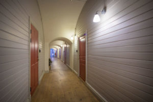 The rooms are not equipped with bathrooms. They are instead situated in separate spaces. In the one two-storey building with 23 rooms there are 3 bathrooms on each floor. In the other building, which houses 4 rooms there is one shower and two toilets. It’s like at home but smaller.